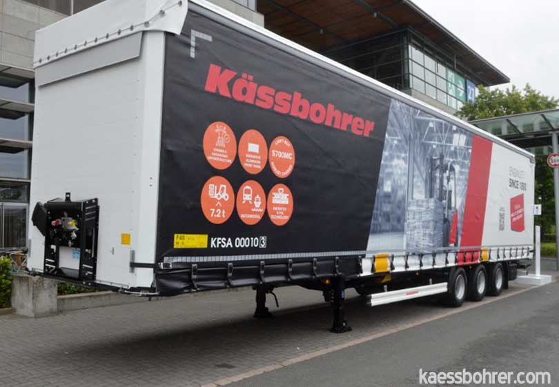 Versione “M” (Mega) del robusto rimorchio telonato Kässbohrer, con altezza ralla di 95 cm e altezza di carico interna di 290 cm.