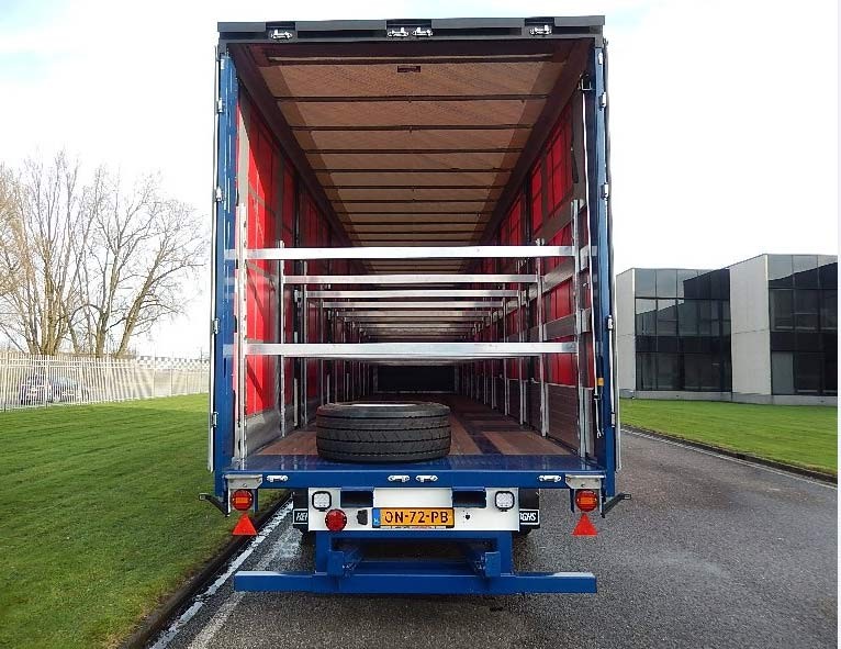 Hertoghs Carrosserieën di Roosendaal ha costruito questi rimorchi per Rabelink. Si tratta di rimorchi telonati con tetto scorrevole, adatti all’utilizzo in configurazione LHV. Il sistema di secondo/terzo piano di carico è particolarmente interessante. Con montanti e traverse speciali, è possibile creare un secondo e persino un terzo piano di carico in diverse posizioni del rimorchio. Ciò consente un utilizzo ottimale del volume di carico. Il rimorchio è adatto al trasporto di un carrello elevatore montato su camion.